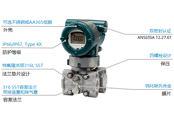 堅固耐用的構造可以幫助您的工廠減少故障。四螺栓保壓設計,DPharp數字傳感器,特氟龍涂層316L不銹鋼法蘭墊圈,ANSI / ISA 12.27.01認證雙重密封 - 所有的設計特點都為延長變送器的使用壽命。